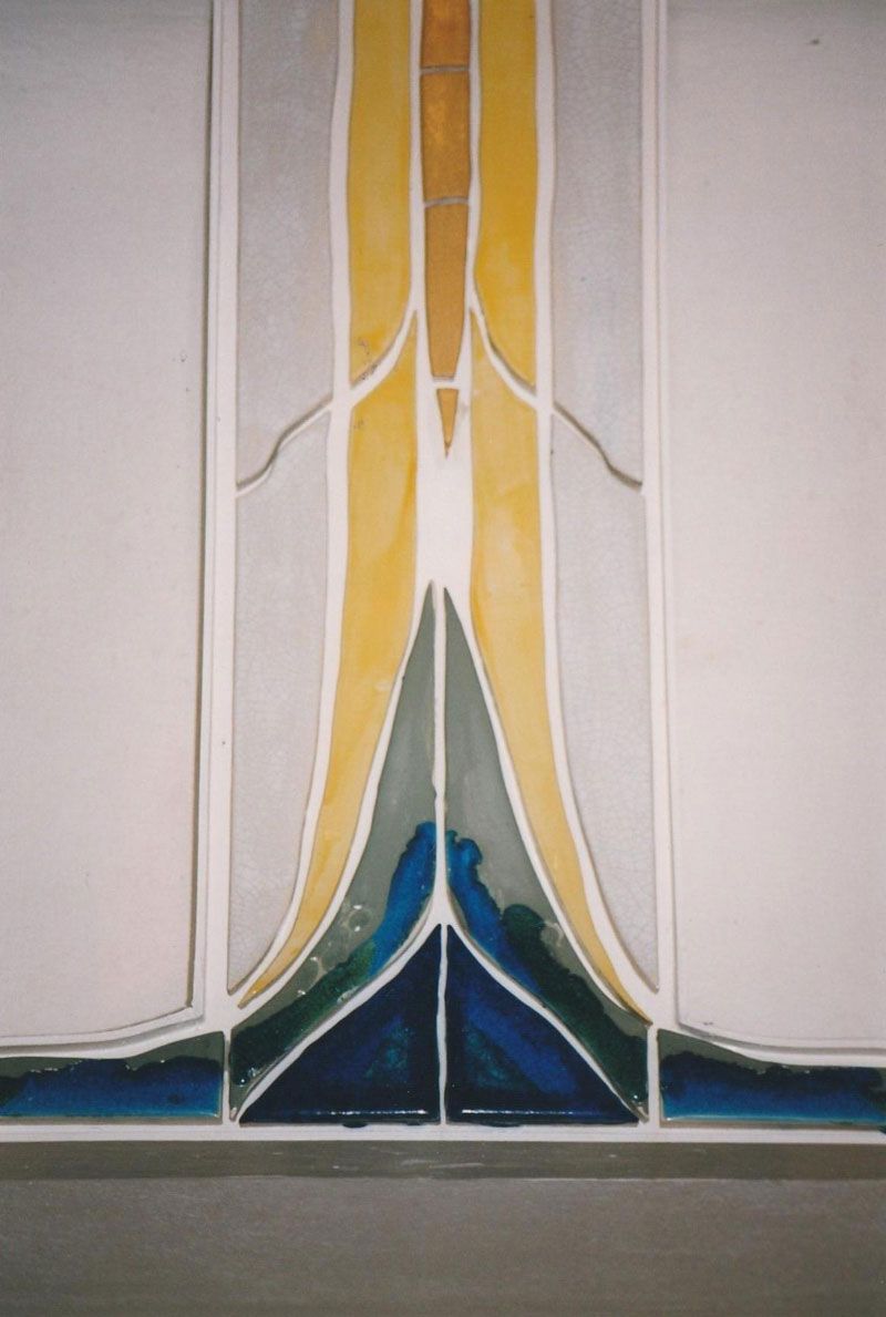 Eingangskreuz: in ein weisses Kassetten-Kreuz aus Keramik wurde ein dunkelblaues Glas-Kreuz eingebettet. Insofern seine Form mit dem Giebel-Kreuz der Kirche korrespondiert, soll die Zusammengehörigkeit beider Bauten betont werden.